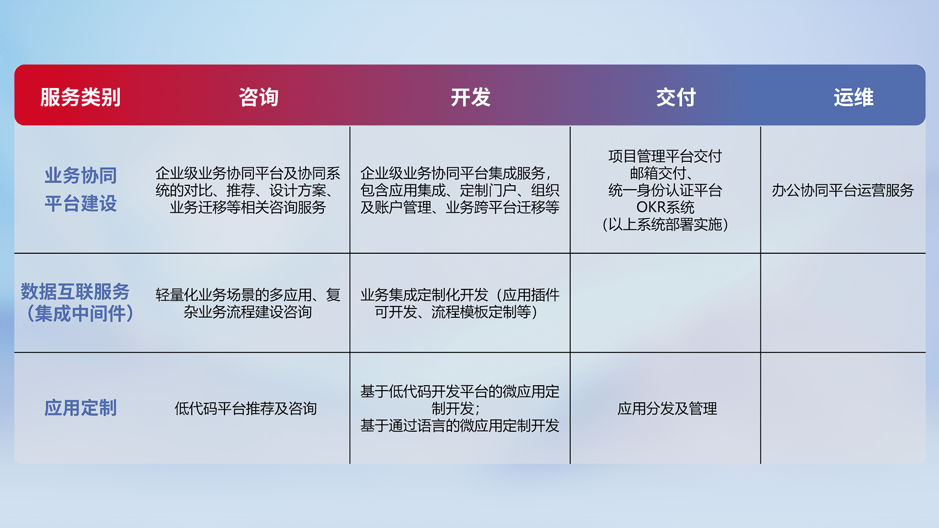 针对钉钉、、、企微、、、IDaas等平台级产品提供产品的规划、、、方案、、、、交付、、定制化开发等服务,,,实现如统一协同办公、、、智能客户服务、、、混合会议管理、、、、智能数据查询、、、、等业务场景,,,实现数字化转型。。