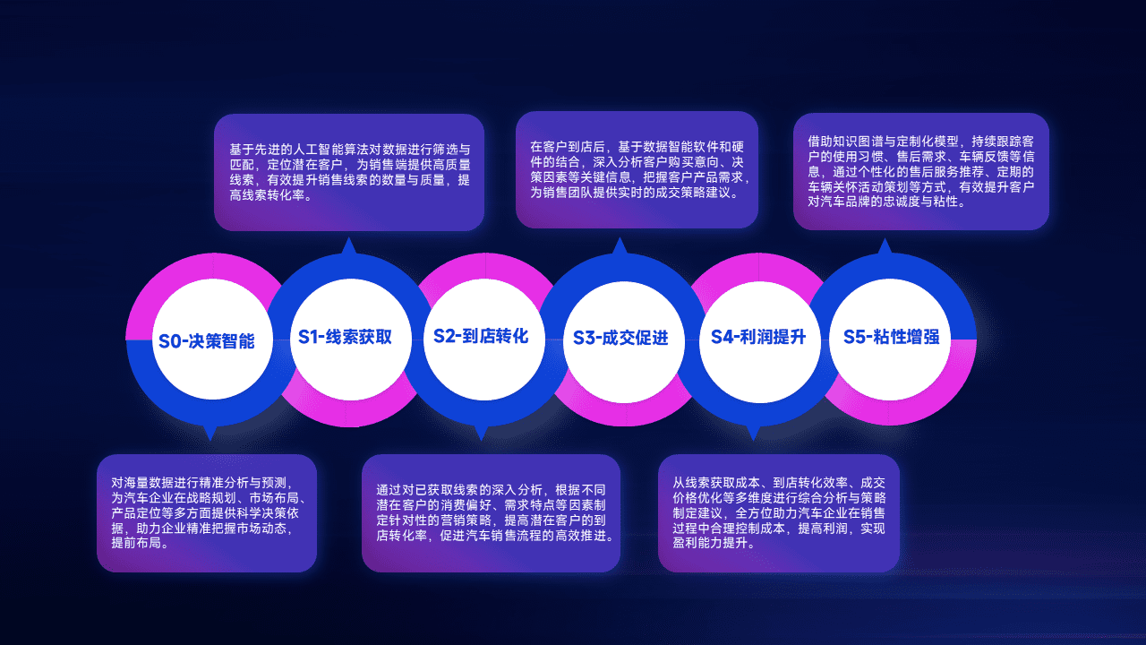 通过拓宽潜在客户来源、、、优化线索分配并提高到店转化率,,,以增强销售效率。。同时,,,利用线索数据不断优化分析模型,,,,有效提升转化率,,,扩大营销影响力。。